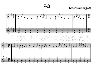 El punto de partida ha sido esta canción creada para este fin, un tema compuesto de 2 partes, una melodía A, con 4 compases en 7/8 y una melodía B con otros 4 compases en 11/8. LA voz de arriba son las flautas y la de abajo instrumentos de placa. A partir de aquí el arreglo se puede complicar mucho más con instrumentos de parche y otras voces, como ostinatos, interludios, etc.
